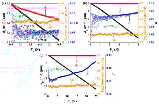 Figure 14a–c show the variations of scratch variables with the applied vertical load Fv during scratching by a spherical intender under three progressive loads (i.e., 5~500 mN, 5 mN~5 N, and 5 mN~25 N). dp increased with increasing Fv in an approximately linear way, which has been widely reported in the literature for different materials (i.e., ceramic, copper, and glasses) [47,51,52], and the proportional coefficient of dp against Fv decreased as the range of Fv increased due to the more prominent increase in contact area. AE intensity stabilized at about 3.4%, and values of dr were negligibly small, indicating the absence of severe damage by the blunt spherical indenter. Although μ could be constant under small loads, it tended to increase slowly as Fv increased, and a prominent increasing trend of μ was seen under large loads. This trend could be attributed to subsurface cracking, under which the fracture toughness was calculated based on the scratch methodology.