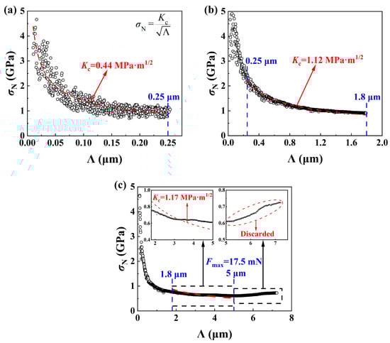 Figure 15a–c show the variation of σN with Λ obtained by a spherical indenter with a radius of 500 μm under different progressive loads of 5~500 mN, 5 mN~5 N, and 5 mN~25 N. Kc was obtained by curve fitting σN vs. Λ using Equation (3), when σN decreases with increasing Λ. Figure 15a shows that Kc obtained under Λ < 0.25 μm was 0.44 MPa·m1/2, which was smaller than the reasonable values since cracking was not developed under small loads by a blunt indenter, under which the predominate role of elastic-plastic deformation resulted in an almost constant level of scratch friction coefficient as shown in Figure 14a. Figure 15b shows that Kc obtained under 0.25 μm < Λ < 1.8 μm was about 1.1 MPa·m1/2, which was a reasonable value since the semi-circular horizontal crack plane in front of the indenter assumed in LEFM was well developed, which was demonstrated by the increase in scratch friction coefficient as shown in Figure 14b. Figure 15c shows that a σN vs. Λ curve could not be fitted well under a large Λ, and σN even tended to increase, which could be explained by noting the formation of complex cracking and surface damage under large loads, which made the assumption of a cracking plane in LEFM invalid. An appropriate fitting curve under a suitable range of a normal load was used for the characterization of fracture toughness by a scratch-based method in order to avoid either a crack-free or a severe damage situation.