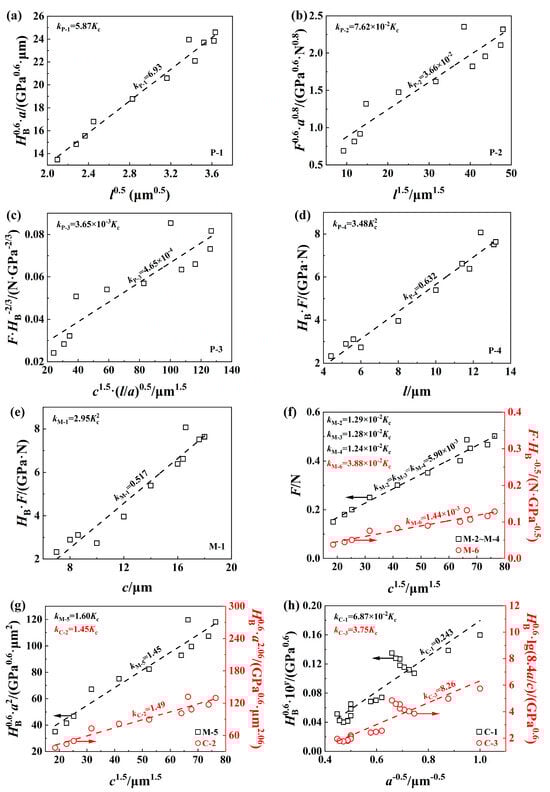 Determining fracture toughness (unit: MPa·m1/2) of SCAM by a Berkovich indenter based on the expressions listed in Table 1: (a) P-1; (b) P-2; (c) P-3; (d) P-4 (e) M-1; (f) M-2~M-4 and M-6; (g) M-5 and C-2; (h) C-1 and C-3.