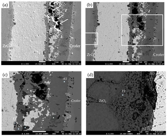 - The oxidation of the interface for the Crofer side was more vigorous than that of the ZrO2 side. The thickness of the interfacial reaction layer on the Crofer side was approximately 10 and 20 μm. In contrast, the interfacial thickness of the ZrO2 side was approximately 5 μm.