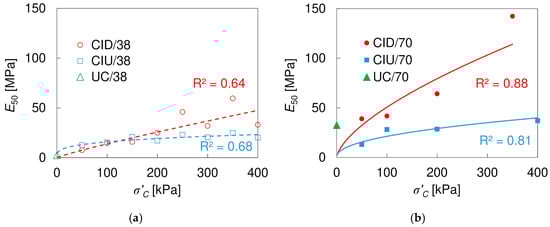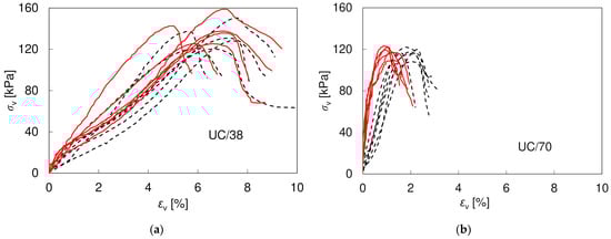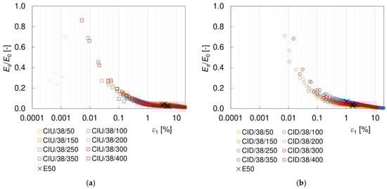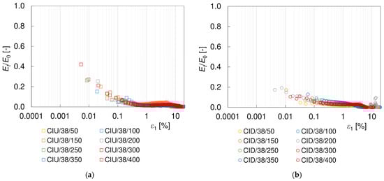 - Tangent stiffness moduli show higher variability, as they are very sensitive to any changes in the slope of the stress–strain curve. Their values are smaller than the secant moduli, and after achieving maximum stress intensity, they fall below zero. There is no obvious relationship between the secant and tangent moduli.