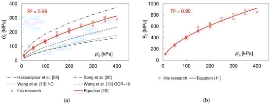 - The initial moduli G0 and E0 increase with consolidation pressure, and the dependency can be described with a classical power function. The values obtained for the loess–sand mixture are higher than those published for natural loess, due to the higher density and sand content, confirming the positive influence of compaction and sand admixture on loess stiffness.
