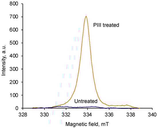 Electron spin resonance spectra of polyurethane, both untreated and treated with a fluence of 5 × 1015 ion/cm2. The spectra were integrated, and the intensity is proportional to the concentration of free radicals in polyurethane.
