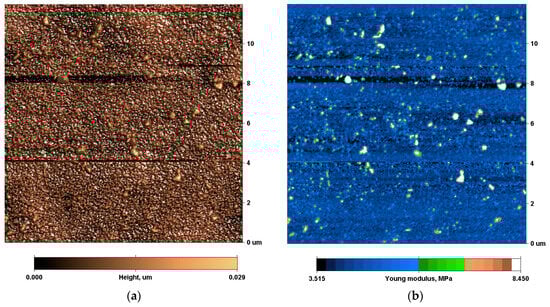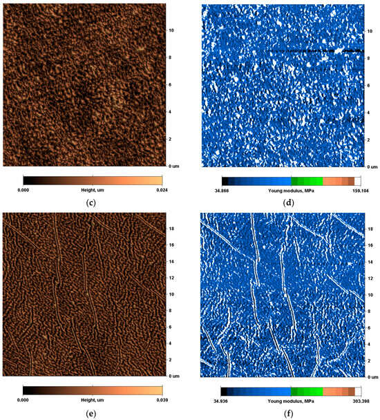 The surface of the untreated polyurethane was quite smooth and was determined by the morphology of the substrate on which the polyurethane was synthesized (Figure 2). The surface relief of the treated samples was characterized by cracks and waves. The cracks became visible in samples treated 80 s and longer. The modulus of the surface layer increased with the treatment time. At 800 s, the surface modulus became almost 1 GPa. The bottom of the cracks had a low modulus. The topography and modulus distribution of the treated polyurethane surface corresponded to a hard surface layer on the top. Due to internal stresses, the top hard layer was cracked, and the layer of the untreated bulk polyurethane underneath became visible.