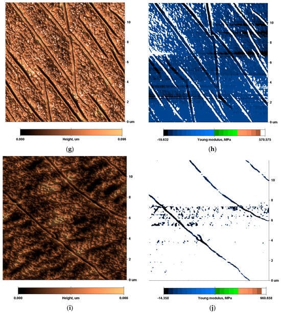Topography (a,c,e,g,i) and Young’s modulus (b,d,f,h,j) of polyurethane surface, untreated (a,b) and treated with fluence of 5·1014 ions/cm2 (c,d), 1015 ions/cm2 (e,f), 5·1015 ions/cm2 (g,h), and 1016 ions/cm2 (i,j).