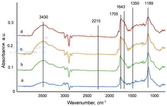 The differential spectra of the treated polyurethane have wide vibration lines of hydroxyl groups in the region of 3600–3200 cm−1 with a maximum of 3430 cm−1; a nitrile group line at 2215 cm−1; a wide line with a multiplet structure in the region of 1750–1500 cm−1 attributed to vibrations of the double bonds C=O, C=N, and C=C; a wide continuum in the region of 1350–1200 cm−1 attributed to vibrations of C-C bonds; and an intense line at 1189 cm−1 attributed to vibrations of C–O bonds (Figure 3). The significantly greater width of the new lines compared to the lines of the original polyurethane indicated a disordered structure that appeared as a result of the treatment with ions. Therefore, the surface of the treated polyurethane consisted of new chemical structures associated with the carbonization, oxidation, and depolymerization of the polyurethane macromolecules. The spectra of the bulk layers of polyurethane and untreated side do not show changes.