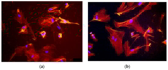 A cell culture of human aortic endothelial cells (HCAECs) was used to evaluate the adsorption of cells onto the surface and the cytotoxicity of polyurethane. The samples were sterilized with ultraviolet light for 10 min on both sides of the sample before applying the cell culture. After sterilization, all samples were kept in a fume hood with sterile reverse airflow. The samples were placed on the bottom of 24-well plates and cells were seeded onto them. MesoEndo Endothelial Cell Media was used. The initial concentration of the cells was 2 × 104 cells/mm2. The cells were proliferated in a sterile incubator at 37 °C in an atmosphere of 5% CO2. The cells were incubated for 2 and 5 days. Then, the cells were fixed with an 80% ethyl alcohol solution for 30 min. The fluorescent dye phalloidin (Phalloidin-TRITC) was used to stain actin microfilaments. Immediately before the observation, the cells were stained with the fluorescent dye DAPI to visualize cell nuclei. After staining, the samples were placed between two glass slides. An Olympus (Tokyo, Japan) IX71 microscope with a digital camera was used to observe the stained cells. Each sample was photographed 10 times in a blind manner using a 10× lens. Detailed photographs of the spread-out cells were taken with a 20× lens. Statistical analysis of the images was carried out using the ImageJ 1.52a software. The high-resolution images of actin microfilaments and nuclei were combined.