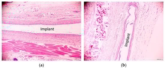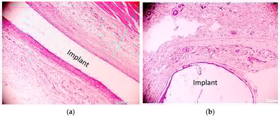 Euthanasia was carried out using carbon dioxide in accordance with the rules of the European Convention for the Protection of Vertebrate Animals Used for Experimental or Other Scientific Purposes. The implant samples were cut out along with the tissue, approximately 3.5 mm around the polymer sample. The extracted tissue pieces were fixed in a 10% neutral formaldehyde solution for 24 h. All samples were stored in a closed container in the refrigerator before histological investigation.