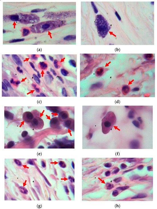 Characteristic view of specific cells in the tissue near the untreated (a,c,e,g) and ion-beam-treated (b,d,f,h) implants. Arrows shows specific cells: (a,b) is basophils, (c,d) is eosinophils, (e,f) is macrophages, and (g,h) is neutrophils.