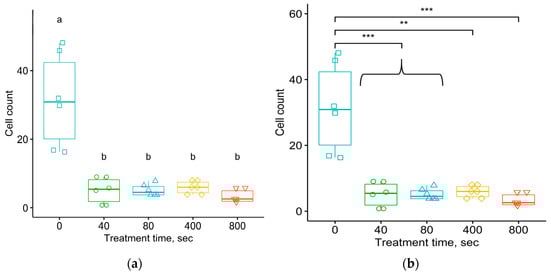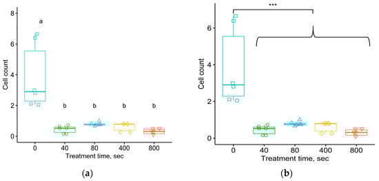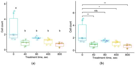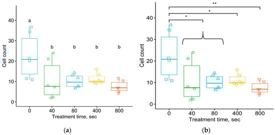 The number of neutrophils per 1 mm2 area of the connective tissue shell around implants treated at different fluences. Comparison of sample means using Student–Newman–Keuls (a) and Tukey (b) tests. ANOVA test shows p = 0.00956. For Student–Newman–Keuls test, the “a” and “b” notifications are related to the groups of data with significant differences in means between them.