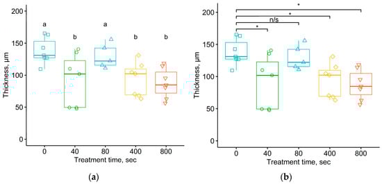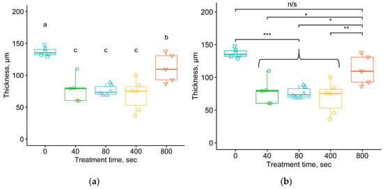 Thickness of the connective tissue shell after 1 month of exposure of the polyurethane implant in the organism under different implant treatment fluences. Comparison of mean values using the Student–Newman–Keuls (a) and Tukey (b) tests. ANOVA test shows p = 0.00909. For Student–Newman–Keuls test, the “a” and “b” notifications are related to the groups of data with significant differences in means between them.