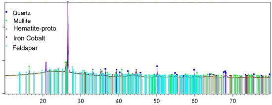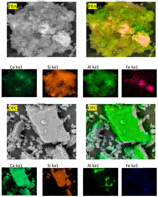 Traditional ordinary Portland cement (OPC) was obtained from Boral company, Sydney, Australia, conforming to AS 3972 [40] for Type GP and FBA from Vale Point Power Station in NSW were used as the raw materials. To prepare FBA for use as a cement substitute, the FBA was oven-dried for 24 h at 105 °C and sieved using a 2.36 mm sieve. Then, ball milling was conducted using an Across International PQ series planetary ball mill, with the ball milling mode set to unidirectional. A constant speed of 450 rpm was maintained for a grinding period of 30 min. The chemical compositions of OPC and ground FBA (GFBA) were then determined by XRF, as shown in Table 1. OPC primarily consists of CaO (70.91%), with Al2O3, SiO2, and Fe2O3 percentages of 4.64%, 15.30%, and 3.4%, respectively. In contrast, GFBA is mainly composed of SiO2, Al2O3, and Fe2O3, which collectively represent around 84.9% of its total mass. The findings from the XRF analysis were reinforced by the EDS analysis shown in Figure 1, which indicates SiO2, Fe2O3, and Al2O3 as the dominant oxides in GFBA. It is evident that GFBA complies with the ASTM C618 [41] requirements for Type F pozzolanic materials, especially fly ash (FA), as well as the AS/NZS 3582.1: 2016 [42] standards. The mean sum of its pozzolanic content (SiO2 + Al2O3 + Fe2O3) exceeds 70%, achieving 86.7% of the total weight ratio in its chemical composition. Additionally, its calcium content is 2.40%, which falls within the ASTM C618 and AS/NZS 3582.1: 2016 requirements for Type F. Specifically, ASTM C618 sets a maximum of 5% calcium content, while AS/NZS 3582.1: 2016 stipulates it should not exceed 10% (25% for New Zealand specifications) for the three grades (I, II, and Special grade). Figure 2 shows the XRD patterns of FBA, with a semi-quantitative XRD analysis conducted using the EMPYREAN diffractometer system (Cu Kα 1.54 Å) and PANalytical Data Collector software v.4.7. The analysis covered a 2θ range from 10.02° to 79.95°, with a step size of 0.0390° and scan step time of 195.585 s. HighScore Plus software v5.2, along with the ICDD database, was used for peak fitting and matching/searching, enabling semi-quantification of the sample’s mineralogical composition. The XRD analysis showed that GFBA primarily comprises silicon oxide (60%), mullite (27%), Feldspar (9%), and others constituents such as Hematite-Proto and Iron Cobalt.