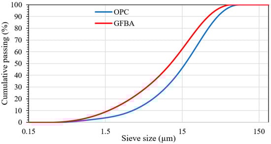 Figure 3 illustrates the particle size distribution, while Table 2 presents the physical properties of OPC and GFBA. The properties of particle size distribution and specific surface areas were determined using MasterSizer2000 (Malvern Panalytical Ltd., Malvern, Worcestershire, UK) with water as the dispersant medium, as both materials dissolve easily in water. Additionally, a helium gas pycnometer was used to determine specific gravity. Three samples of each material were measured to determine specific gravity, particle size distribution, and specific surface area, and the averages were taken. The densities of OPC and GFBA were 3.12 and 2.45 g/cm3, respectively, while the specific surface areas were 8650 and 9857 cm2/g.
