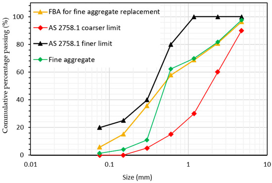 The fine aggregate consisted of a combination of river sand and fine crushed stones in a 1:1 ratio, sourced locally and sieved through a 4.75 mm sieve. For FBA utilized as a replacement for fine aggregate, it was oven-dried for 24 h at 105 °C and sieved through a 4.75 mm sieve. The particle size distribution of FBA and the fine aggregate, compared to the upper and lower limits of AS 2758.1 [43], is presented in Figure 4. The physical properties of FBA as a fine aggregate alternative and the fine aggregate are shown in Table 3. The fineness moduli of the combinations of fine aggregates and FBA were 4.7 and 4.4, respectively. The specific gravity and water absorption of FBA and the fine aggregate were also determined in accordance with AS 1141.5 [44], while the densities and moisture content were measured according to AS 1141.4 [45] and AS 3583.2 [46], respectively. The water absorption of the combinations of fine aggregates and FBA were 1.2% and 11.30, respectively, while bulk densities were 1650 kg/m3 and 950 kg/m3, respectively.