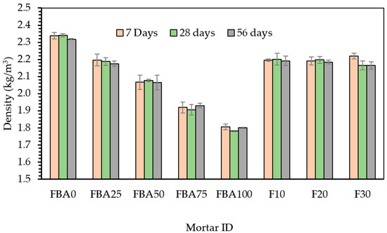 Figure 7 presents the densities of the prepared mortar samples measured at 7, 28, and 56 days, with varying percentages of FBA as fine aggregate and cement replacements. From Figure 7, the density decline is obvious in the case of using FBA as a fine aggregate. For the FBA0 mix, which had no FBA replacement, the densities were 2.34, 2.34, and 2.32 kg/m3 at 7, 28, and 56 days, respectively. The FBA25 mix has densities of 2.20, 2.19, and 2.17 kg/m3 at the respective time points, showing a similar gradual decrease. This trend was consistent across the mixes with higher FBA contents; for instance, the FBA100 mix, in which the fine aggregate was fully replaced by FBA, recorded the lowest densities across all the time points—1.81, 1.78, and 1.80 kg/m3. The reduction in the mortar density with the increase in FBA content might be due to the lower density of FBA compared to the fine aggregate it replaces. In the case of the inclusion of GFBA as partial cement replacement, there was no regular trend in densities. For example, F10 showed a 0.6% higher density compared to FBA25 at 28 days. This could be attributed to the filling effect, leading to a more compact matrix. The reduction extent of densities was lower than that of using FBA as a fine aggregate. However, the F20 mortar showed similar densities to those of FBA25, while F30 showed lower densities by around 1%. Compared to previous studies, Mangi et al. [57] and Oruji et al. [27] found that mortar densities decreased with increasing replacement levels of cement by GFBA. They attributed this to the lower specific gravity of GFBA compared to Portland cement. Similarly, in the case of fine aggregate replacement, several studies [58,59,60] indicated a decrease in mortar density when FBA was used as a sand substitute. This is due to the lower specific gravity of FBA, which ranges from 1.3 to 2.2 g/cm3, as summarized by Onaizi et al. [7], compared to approximately 2.5 to 2.65 for conventional aggregates. These findings are consistent with the results of this study, which observed a clear reduction in mortar densities with increased fine aggregate replacement due to the lower density of FBA (1.45 g/cm3) compared to 2.5 g/cm3 for the natural fine aggregate.