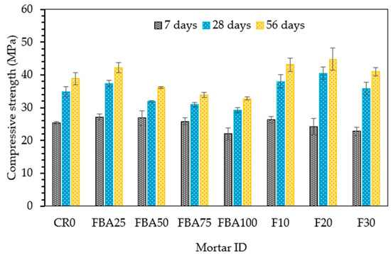 Figure 8 depicts the compressive strength of the mortar samples with various replacement levels of FBA over time, specifically at 7, 28, and 56 days. The control mix (CR0), without any FBA replacement exhibited an initial compressive strength of 25.4 MPa at 7 days, which substantially increased to 34.9 MPa at 28 days and reached 38.9 MPa at 56 days. In contrast, the FBA25 mix, with a 25% replacement of fine aggregate by FBA, started with a higher initial strength of 27.2 MPa at 7 days, surpassed CR0 at 28 days by 7.2%, and achieved the highest compressive strength among all mixes at 56 days with 42.3 MPa. For the FBA50, FBA75, and FBA100 mixes, there was a slight decrease in strength at all time points compared to CR0, and the strength reduction increased with increase in fine aggregate replacement level. However, FBA50 achieved higher strength by 5.9% compared to the control sample without FBA. This could be attributed to the partial pozzolanic reaction between the fine particles of FBA and Ca(OH)2, resulting in the enhancement of the early strength [61]. This potentially occurs with all mixes containing fine FBA as sand; however, at high replacement levels, the negative effect of FBA porosity and weak FBA particles likely outweighed that improvement. When 10% and 20% GFBA were used as cement replacements with 25% of FBA as a fine aggregate replacement, there was more enhancement of compressive strength. The compressive strength of both mixes, F10 and F20, surpassed those of CR0 and FBA25 at 28 and 56 days. This indicates the effectiveness of co-incorporation of GFBA as partial replacements for both cement and fine aggregate. This improvement might be correlated to improvement of microstructures, which provides a more compacted and stronger bonding possibility between the binder and the aggregate. Meanwhile, the finer particles and those used as a substitute for cement reacted with the Ca(OH)2 produced from the initial cement hydration, providing additional hydrates [62]. The relevant studies [63,64] indicate that the improvement in the strength of cementitious mixtures is enhanced by the growth of AFt, which significantly improves the microstructures of the matrices. This was specifically observed in this study for the F10 and F20 samples (as discussed in Section 3.6). These results align with previous observations reported in the literature. For instance, a study [65] indicated that compressive strength associated with a 15% replacement level of FBA surpassed that of control specimens by approximately 17% at 28 days. Similarly, another study [66] reported that 10% GFBA increased compressive strength by around 10% at 28 days. Moreover, another study [24] noted comparable compressive strength to control specimens at 28 days for specimens made with 10% and 20% FBA. These findings suggest that finely ground coal bottom ash can improve the compressive strength of mortars by up to 20% by mass substitution compared to a control mortar without GFBA. However, these findings contradict some earlier studies [20,23,67] that reported a reduction in mortar strength regardless of the replacement ratios. It was suggested that the lower early-stage strength gain was due to the lower activity of the GFBA, which retards the cement hydration process [7,59]. However, it is important to note that these previous studies focused on the use of GFBA as a cement substitute, and there are currently no results available on the combined replacement of fine aggregate and cement.