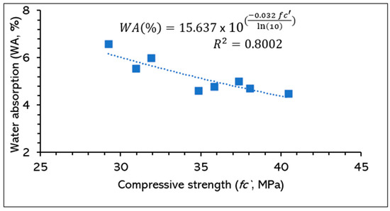 The relationship between the compressive strength and water absorption of the designed mortars at 28 days is illustrated in Figure 11. The water absorption was found to be inversely proportional to compressive strength, whereby the water absorption dropped from 6.6 to 4.5% and the strength increased from 29.2 to 40.5 MPa. The exponential regression method was applied to correlate the experimental data with the R2 value of 0.8002, indicating a significantly good confidence in the relationships.