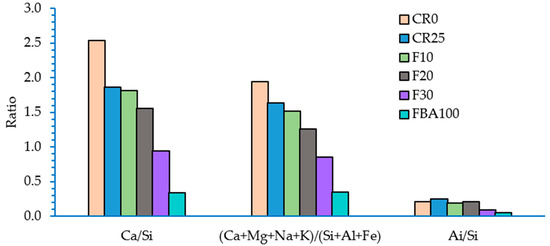 Despite the consensus among researchers regarding the impact of both Ca/Si and Al/Si ratios on the mechanical properties of cementitious composites, the nature of this relationship remains debated. Some studies [78,79] suggest that the values of the modulus of elasticity and creep increase with the rise in Ca/Si ratio, which might explain the higher flexural strength of CR0 compared to other samples. Conversely, other studies indicate optimal Ca/Si ratios, deviations from which negatively affect mechanical properties. For instance, Wang et al. [80] found that the typical Ca/Si ratio, when incorporating fly ash, is around 1.4, while Garcia’s results [81] suggest a value closer to 1.8. Wang [80] also noted that the optimal Al/Si ratio is approximately 0.25, which is close to the values observed for the mortar samples with optimal performance obtained in this study: 0.24, 0.19, and 0.21 for FBA25, F10, and F20 samples, respectively. This ratio decreased to 0.09 and 0.05 for the F30 and FBA100 samples, respectively, and this decrease falls within the range defined by Wang et al. [80] as 0.5 to 0.05. Similarly, the Ca/Si ratio also declined to 0.94 and 0.34 for the F30 and FBA100 samples, respectively.