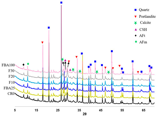 Figure 14 shows the types of crystalline phases formed in the formulated mortars. As observed, six crystalline phases were detected: quartz, portlandite, calcite, calcium silicate hydrate, AFt, and monosulfate (AFm). The figure indicates an increase in the intensity of monosulfate peaks with the increase in the level of cement replacement by GFBA (Supplementary material), especially at a 30% replacement level. This increase was due to the abundance of alumina dissolved from the GFBA, which can react with ettringite in the presence of gypsum to form monosulfate. A slight decrease in AFm peaks was also observed in the outperforming samples such as F10 and FBA25, which may be attributed to its conversion to AFt. This may be due to the chemical instability of AFm, as it may react with calcium carbonate in the presence of appropriate humidity to turn into AFt [91]. Calcite was also observed, with its peaks primarily distributed between 50° and 27°. Its presence can be attributed to the relative instability of Ca(OH)2, which undergoes accelerated carbonation under atmospheric conditions. The quartz peaks were nearly identical in the mortar samples CR0, FBA25, F10, F20, and F30, but their intensity was more pronounced in the mortar containing a 100% replacement level of fine aggregate with FBA.