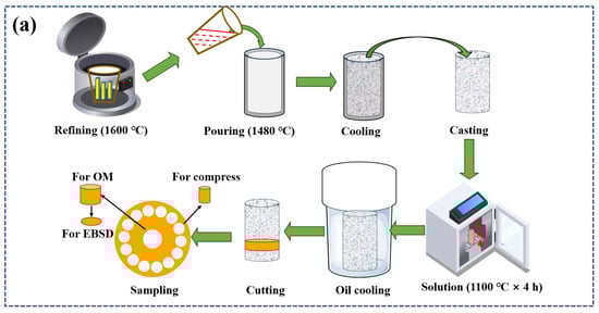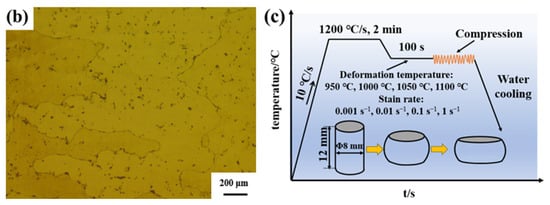 The novel GH4720Li alloys with 99.9% yttrium micro-alloying were produced by remelting and smelting, with their composition shown in Table 1. Alloy ingots were fabricated using vacuum arc remelting furnaces (YC2016-0022, Linyi Research and Innovative Materials Technology Co., Ltd., Linyi, China) and induction melting furnaces (YC2018-0022, Linyi Research and Innovative Materials Technology Co., Ltd., Linyi, China), and the chamber was evacuated to 3 × 10−3 Pa using high-purity argon. Refining was carried out at 1600 °C lasting 10 min, pouring the molten alloy at 1480 °C into a 120 mm diameter Al2O3 ceramic mold. Post casting, the sample underwent a heat treatment at 1100 °C for 4 h, and then oil-cooled. Compressed specimens were bisected using WEDM (JA800, Jiangsu Sevis CNC Technology Co., Ltd, Suzhou, China) with the following parameters: a 24 μs pulse width, an 8 μm discharge gap, a 37.82 mm2/min wire speed, and a 0.1428 duty cycle. See Figure 1a for the material preparation flowchart. To calibrate the Gleeble-3800, thermocouples were connected, and the machine was powered on to access the calibration menu. Zero calibration was carried out according to on-screen instructions, setting the baseline readings. Span calibration involved applying known temperatures to the thermocouples. Prior to compression, lubricant and a 0.1 mm tantalum sheet were placed to reduce friction and ensure a uniform heat distribution. Hot compression specimens (Φ8 mm × 12 mm) were tested at 950–1100 °C, strain rates 0.001–1 s−1, and a true strain of 0.7. During the test, the material was heated to 1200 °C at 10 °C/s and held for 120 s for uniform heating. The material was then cooled to the experimental temperature at 5 °C/s and held for 100 s to eliminate gradients. After compression, water quenching preserved the microstructure, and the data were automatically collected. After cutting, the sample was sequentially sanded with 600#, 1000#, and 2000# grit sandpaper. The sample was then polished with aluminum oxide until a mirror-like finish was achieved. The samples were then etched with Kalling’s solution (100 mL HCl + 100 mL anhydrous ethanol + 5 g CuCl2) and analyzed using an optical microscope (OM: GX71, Olympus, Shinjuku, Japan) at 400× and 1000× magnifications. Etching was carried out by dispensing a corrosive solution onto the polished surface. Etching involved adding a drop of the corrosive solution every 10 s for 50 s. An OM image of the solution-treated alloy is shown in Figure 1b. Electrolytic etching used a 9:1 C2H5OH and HClO4 solution, applying 20 V for 25 s while at approximately 0 °C. Post etching, the sample was cleaned with ethanol and dried with a hair dryer. Electron backscatter diffraction (EBSD: JSM-7800F, Oxfordshire, UK) images were captured at 20 kV and 100× magnification, with a 0.5 μm step and a 500 μm × 500 μm field. The EBSD images were processed and analyzed using Channel 5 software. The experimental specimens and procedure are illustrated in Figure 1c.