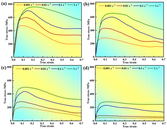 Stress–strain curves of the novel GH4720Li superalloy: (a) 950 °C, (b) 1000 °C, (c) 1050 °C, and (d) 1100 °C.