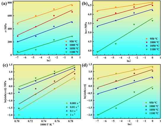 From Equation (2), the β-value and n1-value are determined from the relationships between σ and , lnσ, and , as illustrated in Figure 3a,b. By conducting linear regression analysis on the relationships between and σ at different deformation temperatures, there exists a satisfactory linear relationship. Based on the determination of α = β/n1, the α-value was established. By examining the relationship between lnsinh(ασ) and lnε, as illustrated in Figure 3c, the n-values under different temperature conditions were obtained. It can be observed that the linear correlation coefficients of the regression equation are all higher than 90%, and analysis shows that the n-value gradually increases with rising temperature. Additionally, the highest n-value does not exceed 9, while the lowest value remains no less than 3 across all temperature ranges. Studies have indicated that the stress exponent is associated with the deformation mechanism []. An n-value close to 3 signifies that deformation is primarily controlled by dislocation creep. An n-value above 5 indicates the dominant mechanism is high-temperature creep caused by lattice self-diffusion. When deforming, the novel GH4720Li superalloy consistently exhibits high n-value, indicating that its deformation is primarily governed by high-temperature creep caused by lattice self-diffusion. Figure 3d shows that the stress of the novel GH4720Li superalloy increases with decreasing temperature, exhibiting a strong linear relationship (not less than 0.9), suggesting that Equation (2) can better depict the relationship between σ and . When the novel GH4720Li superalloy ingots are deformed at temperatures of 950 °C, 1000 °C, and 1050 °C, the alloy exhibits high stress index values (ranging from 5.57 to 8.41). This suggests its deformation is predominantly governed by high-temperature climbing caused by lattice self-diffusion. Conversely, when the alloy undergoes deformation at 1100 °C, the maximum n-value is 3.51. This indicates its deformation process is controlled by the viscous slip of dislocations.