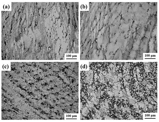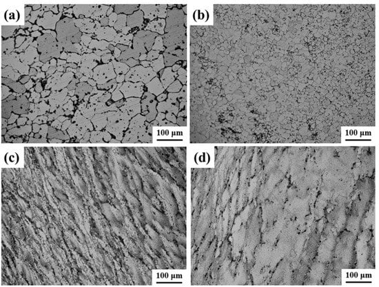OM images of compressed alloy with different strain rates: (a) 0.001 s−1, (b) 0.01 s−1, (c) 0.1 s−1, and (d) 1 s−1.
