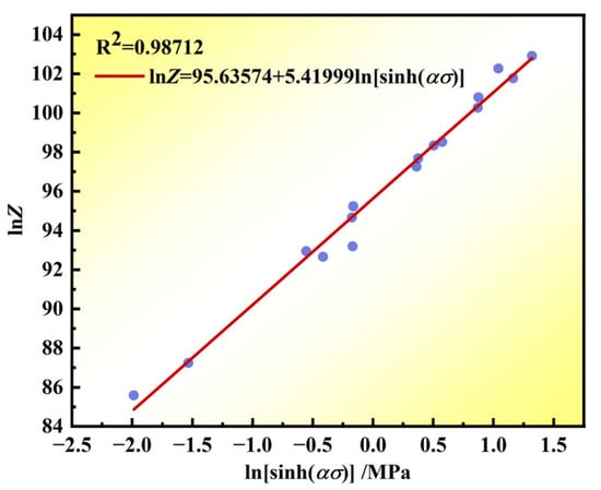 Figure 6 shows the linear fit of lnZ and ln[sinh(ασ)], yielding a slope value (n) of 5.8371 and an intercept value (lnA) of 95.194 (where A = 2.202 × 1041). Bringing the aforementioned Q = 1117966.4 J/mol, R = 8.314 J/mol, n = 5.8371.