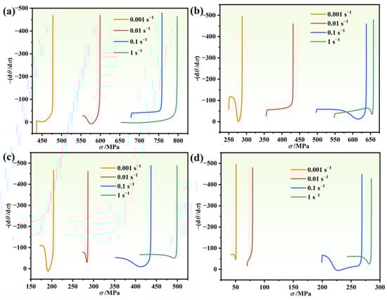 The −(dθ/dσ) − σ curves of Ni-based alloys at different temperatures: (a) 950 °C, (b) 1000 °C, (c) 1050 °C, and (d) 1100 °C.