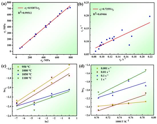 According to Figure 2, the values of σc, σp, εc, and εp for different deformation conditions can be obtained. Figure 8 shows the relationship between σc and σp, and εc and εp, and one can see that the two linear fit better; the Sellars model points out that the ratio of εc and εp is between 0.6 and 0.95, and it can be seen that the conditions are met; therefore, one can obtain the relationship between σc and σp from Figure 8a: