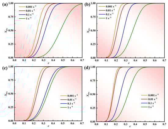 The correlation between Xdrx and true strain for the novel GH4720Li superalloy under various deformation conditions: (a) 950 °C, (b) 1000 °C, (c) 1050 °C, and (d) 1100 °C.