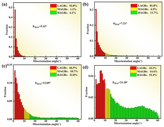 Figure 13 shows the variation of different GB orientations of the novel GH4720Li alloy compressed at 950 °C/1 s−1. The increase in the proportion of LAGBs (LAGBs, <10°) when the amount of deformation is 0.2 and 0.3 indicates that as deformation increases, more dislocations accumulate and entangle in the alloy, resulting in an increase in the proportion of LAGBs. In general, continuous dynamic recrystallization (CDRX) occurs within the deformed grains and is associated with subcrystalline forms and dislocations, while mid-angle grain boundaries (MAGBs, 10°~15°) are considered to be necessary for the occurrence of CDRX. Meanwhile, the MAGBs show an increasing trend, which indicates that CDRX behavior occurs during hot deformation. When the amount of deformation increases to 0.4 and 0.5, the proportion of LAGBs decreases while the proportion of high-angle grain boundaries (HAGBs, >15°) increases, indicating that when the amount of deformation reaches 0.4 and 0.5, the over-absorbed dislocations are converted to HAGBs; then, dislocation-free recrystallized grains are formed, and the proportion of dynamic recrystallization increases, while the proportion of MAGBs continues to increase with the amount of deformation. MAGBs act as a transition zone from LAGBs to HAGBs; therefore, they can be used as a marker of whether the CDRX mechanism is active or not. However, the proportion of MAGBs in the alloys is always small, which suggests that the CDRX mechanism is only an auxiliary dynamic recrystallization mechanism under different deformation amounts.