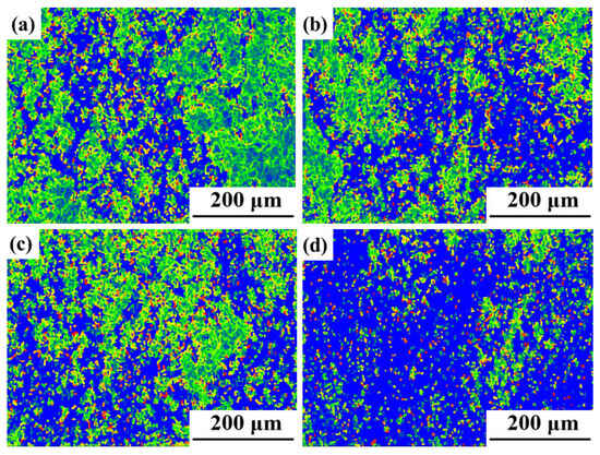 GROD of the novel GH4720Li alloy at 950 °C and 1 s−1 under different true strains: (a) 0.2, (b) 0.3, (c) 0.4, and (d) 0.5.