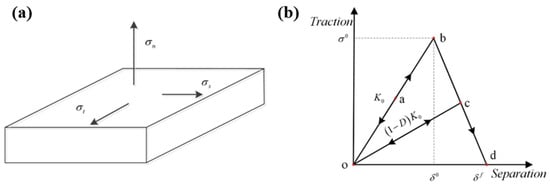 To precisely investigate the interfacial behavior of composite/adhesive and metal/adhesive bonds, cohesive zone models (CZMs) were used to simulate the failure mode of adhesive joints [6,12,13,14,15,16,17]. Figure 1a shows how cohesive elements (CEs) under stress, split into shear (σs), tangential (σt), and normal (σn) components, were utilized to analyze the CZMs. To depict the failure modes of CEs, a bilinear traction law (Figure 1b) was considered a simple method [15,16,17,18,19,20,21], which consisted of an elastic part with a softening stage. As shown in Figure 1b, the stiffness and strength of the cohesive interface are denoted as K0 and σ0, respectively, while the displacements at damage initiation and failure are denoted as δ0 and δf. The interlaminar fracture toughness (GC) can be represented by the area of the triangle marked obd. GC can be obtained from end notched flexure (ENF) and double cantilever beam (DCB) tests [18]. Shindo et al. [17] investigated the Mode I (crack opening mode) stratification of cloth/epoxy using DCB testing at −269.15 °C, −196.15 °C, and room temperature environments via the FEM and experimental schemes. The results show that the value of GC investigated for Mode I (GIC) decreases with a reduction in the test temperature. Balzani [18] obtained the fracture energy release rate of different modes through mixed−mode bending (MMB), DCB, and ENF tests. However, the abovementioned studies only simulated and analyzed the behavior of adhesive joints in dry environments.