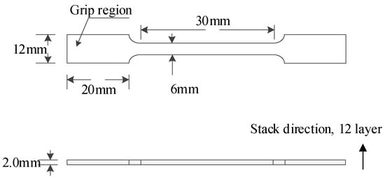 To examine the mechanical properties of the adhesive, 12 sheets of SY−14M−III film with a size of 300 mm × 300 mm were selected and spread into a piece of laminate. During the spreading process, each layer of film was ironed with an 80 °C electric iron to ensure a tight fit between the two layers. As far as possible, remove the large bubbles between the adhesive layers during this process. Note that immediate contact between the body and the film’s surface should be avoided throughout the spreading process. Finally, 12 layers of SY−14M−III were stacked together and cured to manufacture the adhesive laminates. Then, the laminates were cut into the shape shown in Figure 2.