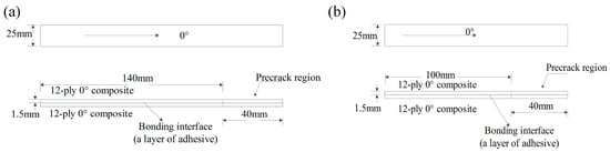 To obtain the interface performance (the interlaminar fracture toughness) of the laminate (CCF800H/AC531, which were supplied by AECC BIAM, Beijing, China)/adhesive (SY−14M−III) specimens, the critical fracture energies GIC and GIIC were obtained by DCB and ENF tests according to ASTM D5528 [29] (GIC) and ASTM D7905 [30] (GIIC, i.e., crack sliding mode interlaminar fracture toughness), respectively. Figure 3 shows the geometric configurations of the laminate/adhesive specimens. An artificial delamination with a length of 40 mm was introduced using 0.01 mm of PTFE film [6,31].