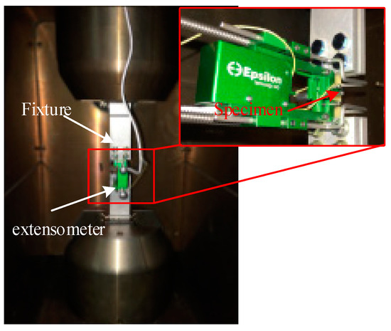 A test machine, Instron 8801 (Instron Corp., Boston, MA, USA, precision 0.1%, and range 100 kN) equipped with an extensometer (precision 0.1%, span 40.8 mm) was used to test the tensile properties of the SY−14M−III adhesive at a 0.5 mm/min loading speed (Figure 6). The specimens were divided into two groups (wet and dry), each containing three specimens.