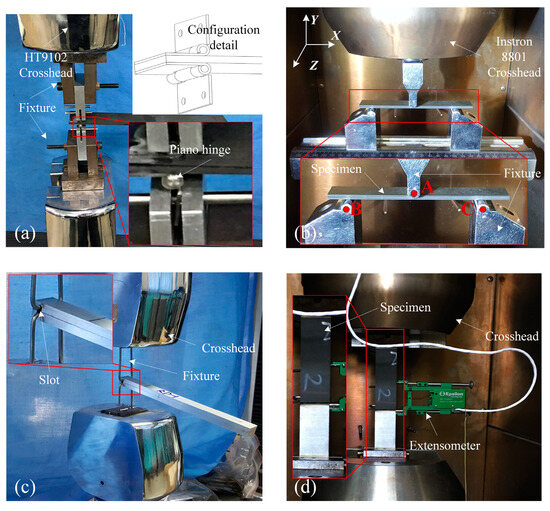 For the composite/metal DLSJ specimens (Figure 7d), the tests were conducted on an Instron 8801 equipped with an extensometer for measuring deformation. In accordance with ASTM D3528, the loading speed was set at 1.25 mm/min.