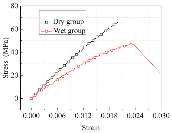 The results of the adhesive tensile tests were concentrated on the tensile strength and modulus. The stress−strain curves of the adhesive specimens in dry and wet environments are compared in Figure 8. The wet environment has a significant negative impact on tensile strength and modulus, which decreased by approximately 28.1% (dispersion 3.8%) and 30.9% (dispersion 4.5%), respectively.