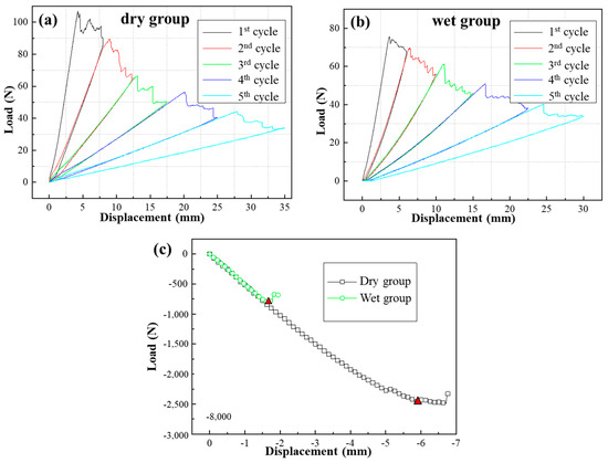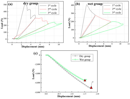 The load−displacement curves of the GC tests under different environments are illustrated in Figure 9, and each curve of the GIC specimens contains five cycles. Figure 9 shows that the ultimate loads of the composite/adhesive GC tests significantly decrease after immersion in water. Table 2 summarizes the average values for the GC specimens, which were calculated using the method shown in ASTM D5528 and ASTM D7905. It should be noted that the red triangles shown in Figure 9c were taken as the failure points for the ENF test. The GIC of the wet group specimens decreased by approximately 32.6%, and the GIIC reduced by 91.2%.