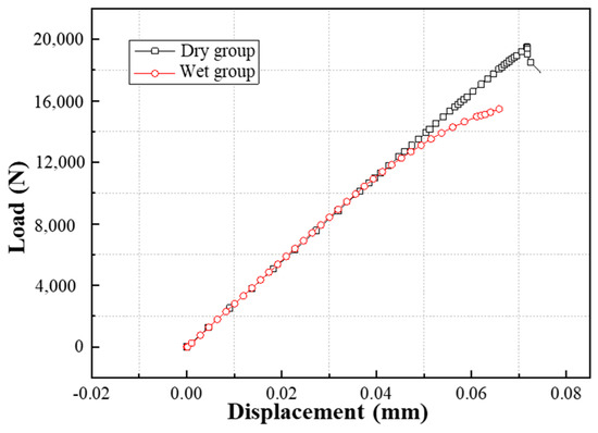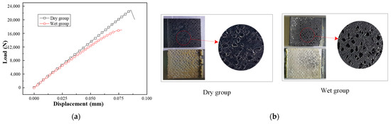 The load−displacement curves of the DLSJ samples under dry and wet environments are exhibited in Figure 11a, where the displacement was measured using a 40.8 mm span extensometer. The ultimate load of the wet group specimens decreased by approximately 25.4%, while the initial stiffness (the slope of the load−displacement curve) of the DLSJ specimens in different environments was nearly invariable, indicating that the moisture treatment significantly affects DLSJ strength and slightly influences stiffness. The failure modes corresponding to the different environments are different. Figure 11b shows the typical failure modes of the specimens under dry and wet environments. The main damage is adhesive failure in the dry group, while the main damage is interlaminar failure in the wet group. The same phenomenon can be noticed in the previous work [31].