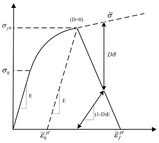 Figure 13 shows the mechanical behavior of the adhesive with gradual damage degradation. σy0 is the maximum equivalent Mises stress, measured via the bulk adhesive test; σ0 is the yield strength of the adhesive; is the plastic strain; and is the elongation at break [33,34,35,36,37].