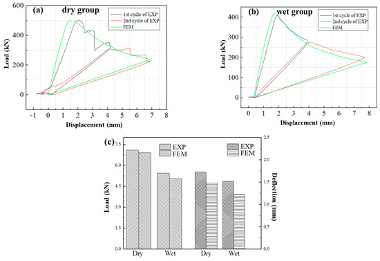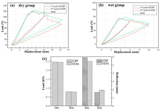 Comparison of EXP results and FE results for the composite/adhesive specimens: (a) DCB test results for the dry group, (b) DCB test results for the wet group, (c) ENF test results.