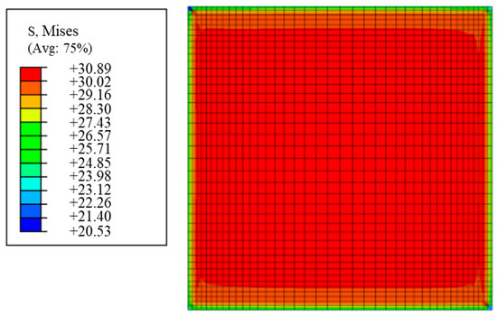 Figure 16 shows the Mises stress distribution of the adhesive under a wet environment, from which the maximum stress appears at the inner part of the adhesive, and the values are less than the critical stress. This suggests that the cracks observed in the DLSJ tests were generated during the tensile process and not during the hygroscopic process. It can also be known that the stress distribution of the adhesive after moisture absorption was not uniform, and it is necessary to add pre−stress to the adhesive in the DLSJ model.
