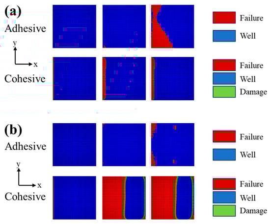 The tensile load−displacement curves for the DLSJs with FE analysis are depicted in Figure 17. The nominal shear strength of the DLSJ specimens is shown in Figure 18. It can be seen that the FEM was a useful tool for predicting the shear strength of the DLSJ samples under different environments, with errors of −8.5% and 5.0% for the dry and wet groups, respectively. Figure 19 shows the progress of damage evolution in the adhesive and cohesive regions. The dry group’s initial damage occurs at the left side (near the metal part) of the cohesive region (the interface between the composite and the adhesive), and when the damage expands to a certain status, the damage is transferred to the adhesive region from the cohesive region, presenting adhesive failure modes. For the wet group, the initial damage also occurs at the left side of the cohesive region, and when the damage expands to half of this region, the fracture transfers to the adhesive region.