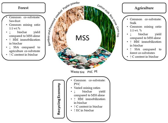 The co-pyrolysis of MSS with other co-substrates results in biochar with enhanced chemical properties. These properties include a higher mineral content, lower S and N content, improved aromatic structure as well as reduced HM concentrations and ecotoxicity of the resultant biochar [,,].