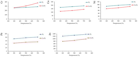 MSS typically contains HMs in the form of mineral salts (chlorates, carbonates, sulfates, phosphates), sulfides, hydroxides, and oxides. Upon exposure to pyrolysis, these HMs undergo a transformation process that leads to their conversion into more thermostable compounds compared to the original HMs. The reduced levels of certain HMs, particularly at high temperatures, indicate the possibility of partial defractionation and/or partial volatility of these elements at elevated temperatures, as observed by Zielinska et al. []. Similarly, Hossain et al. reported a similar phenomenon of a decreasing total content of Cr, Ni, and Pb during MSS pyrolysis at 700 °C [].