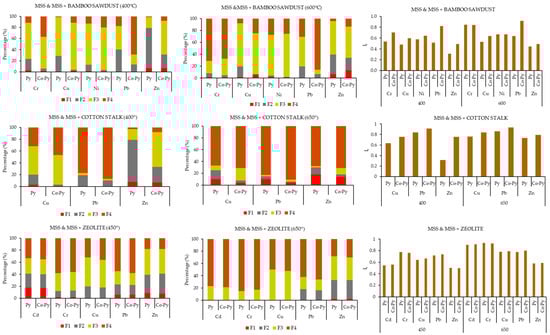 With HM distribution patterns, it is possible to access their stability using the reduced partition index (Ir). In Figure 3, exemplary changes in the HM distribution for biochars obtained from pyrolysis and co-pyrolysis, and the resultant stability (as Ir), for two opposite pyrolysis temperatures are compared. For this comparison, only selected co-substrates, such as bamboo sawdust, cotton stalks and zeolite, were chosen for evaluation, as the HM distribution is not always analyzed in biochars, making it difficult to consider other co-substrates. When comparing the fractionation and stability of HMs at moderate (400–450 °C) and higher (600–650 °C) temperatures for pyrolysis and co-pyrolysis biochar derived from MSS and the above co-substrates, a notable observation was made.
