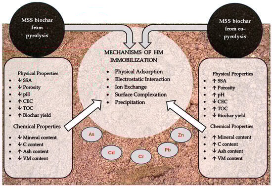 In this review, we aim to systematically investigate the effects of co-pyrolysis on the properties of MSS biochar and its application in the remediation of HM-contaminated soils. This review investigates how different co-substrates affect the physical and chemical properties of MSS biochar, and it explores the underlying processes and mechanisms that facilitate the immobilization of HMs. By summarizing recent studies on the use of MSS biochar for soil remediation, this review provides an overview of current applications, including conditions for effective HM immobilization. This review can serve as a valuable resource for researchers and practitioners by providing a holistic view of the benefits, mechanisms, and applications of co-pyrolyzed MSS biochar. Finally, this review suggests future research directions to optimize the use of MSS biochar in environmental management and soil remediation, demonstrating its potential for soil pollution control.