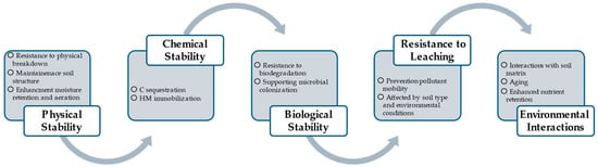The HM bioavailability in biochar is usually determined based on single extraction protocols (e.g., test with DTPA) or with sequential extraction (e.g., BCR extraction procedure). Despite its complexity, sequential extraction offers a comprehensive assessment of the risks associated with HMs. This methodology facilitates the determination of both the bioavailable fraction and the fraction bound with varying bond strengths to different matrix components. A recent study by Bai et al. showed that MSS pyrolysis significantly immobilizes HMs by converting unstable, acid-soluble, reducible, and oxidizable fractions to stable residual fractions []. The co-pyrolysis of MSS with co-substrates such as cotton stalk, willow, or hazelnut shell has also been found to synergize HM immobilization more efficiently as compared to MSS biochar alone []. Kończak and Oleszczuk explored the effects of mixing MSS and willow on the available fraction of Cd, Co, Cr, Cu, Fe, Ni and Pb [].